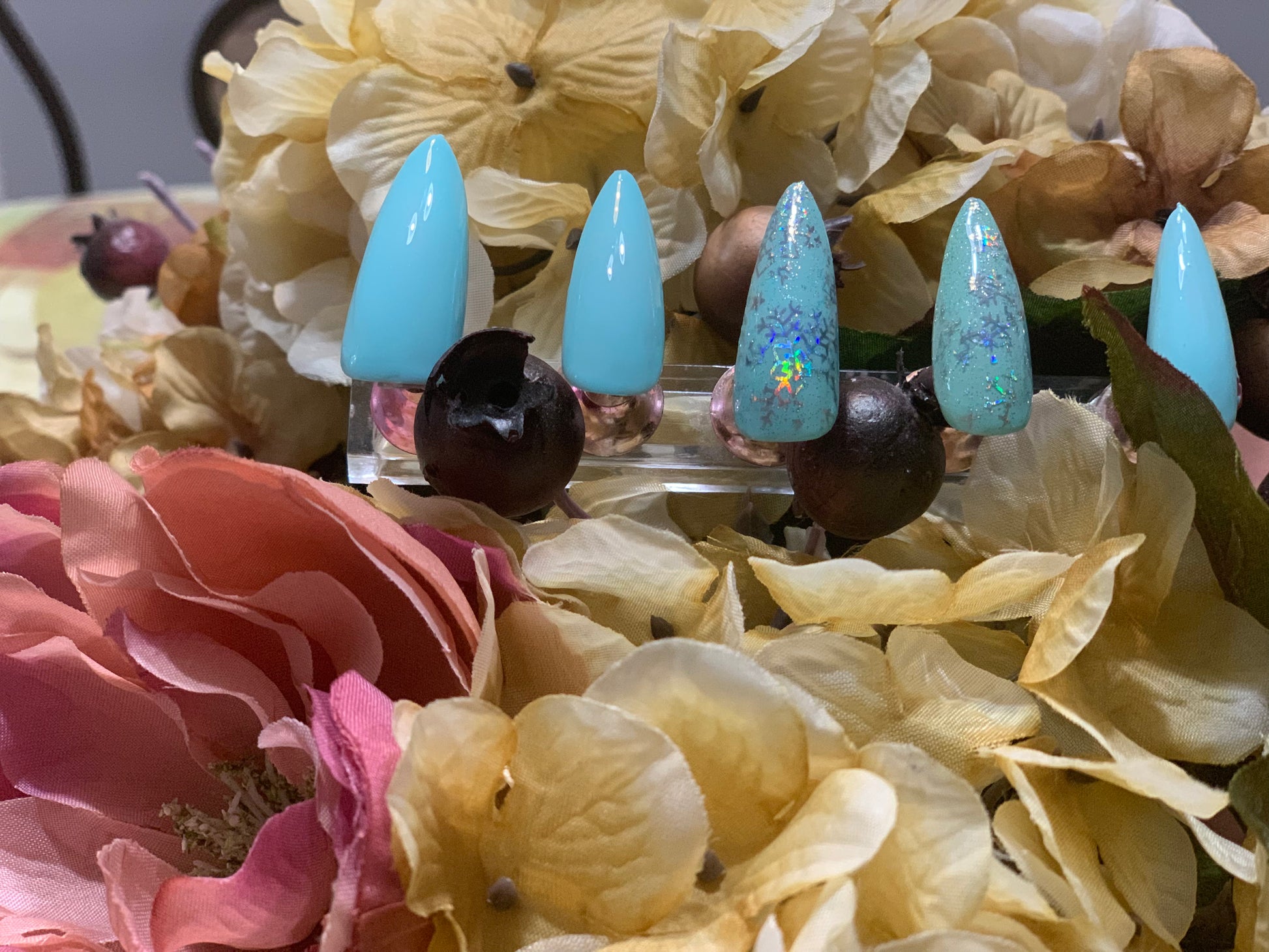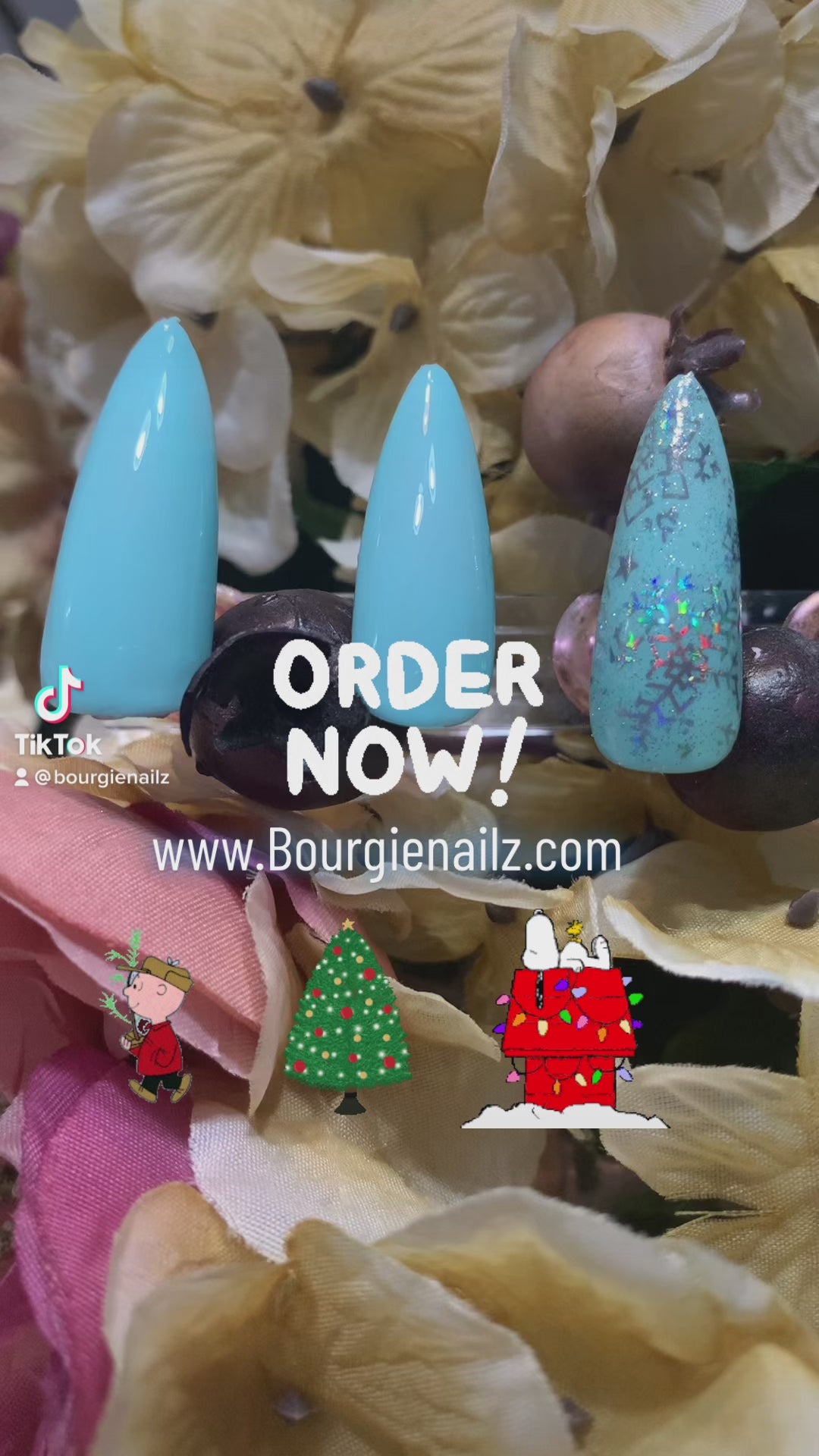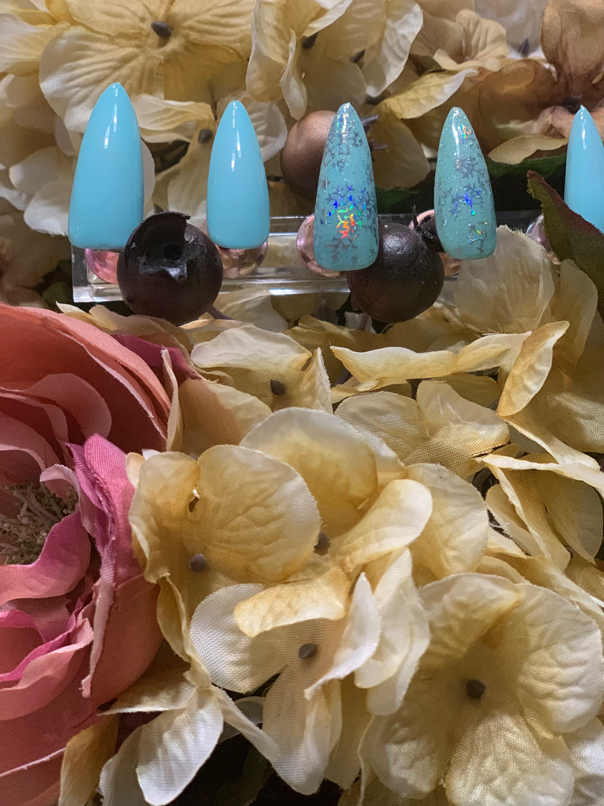 These nails were inspired by the cold weather and snow. The nails feature powder blue nail polish and the accent nails have snowflakes . These nails will make a great affordable Christmas present