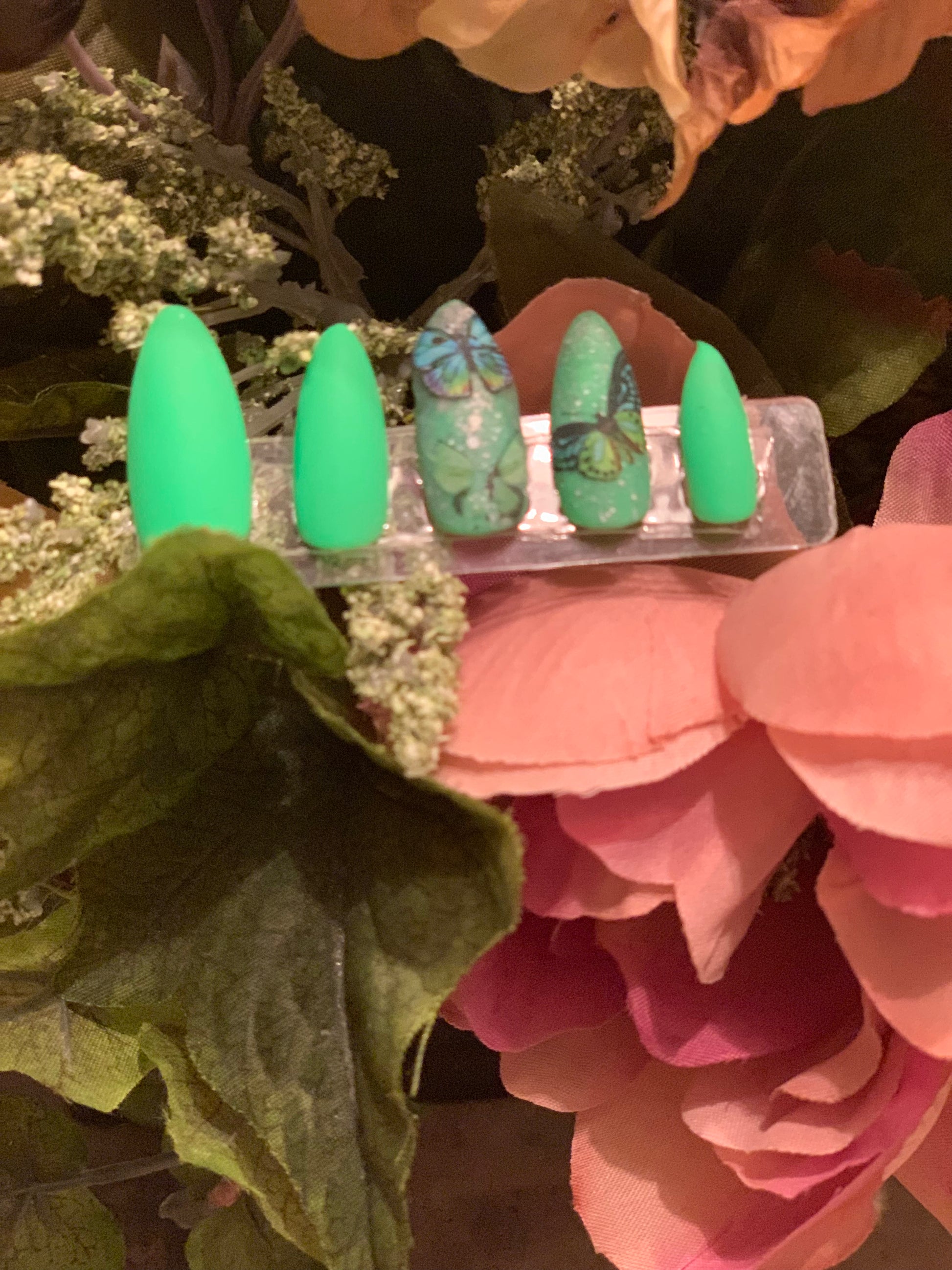 These nails are the for the bold only! They are the color of envy with butterflies on the accent nails. Make them stop, look, and stare when you wear these nails .